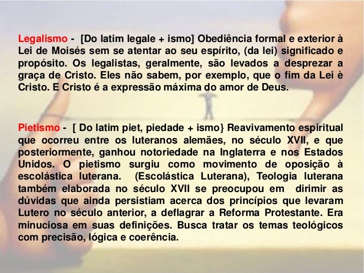 9. 9. Legalismo- [Do latim legale + ismo] Obediência formal e exterior à Lei de Moisés sem se atentar ao seu espírito, (da lei) significado e propósito. Os legalistas, geralmente, são levados a desprezar a graça de Cristo. Eles não sabem, por exemplo, que o fim da Lei è Cristo. E Cristo é a expressão máxima do amor de Deus.<br />Pietismo - [ Do latim piet, piedade + ismo} Reavivamento espiritual que ocorreu entre os luteranos alemães, no século XVII, e que posteriormente, ganhou notoriedade na Inglaterra e nos Estados Unidos. O pietismo surgiu como movimento de oposição à escolástica luterana. (Escolástica Luterana), Teologia luterana também elaborada no século XVII se preocupou em dirimir as dúvidas que ainda persistiam acerca dos princípios que levaram Lutero no século anterior, a deflagrar a Reforma Protestante. Era minuciosa em suas definições. Busca tratar os temas teológicos com precisão, lógica e coerência.<br />