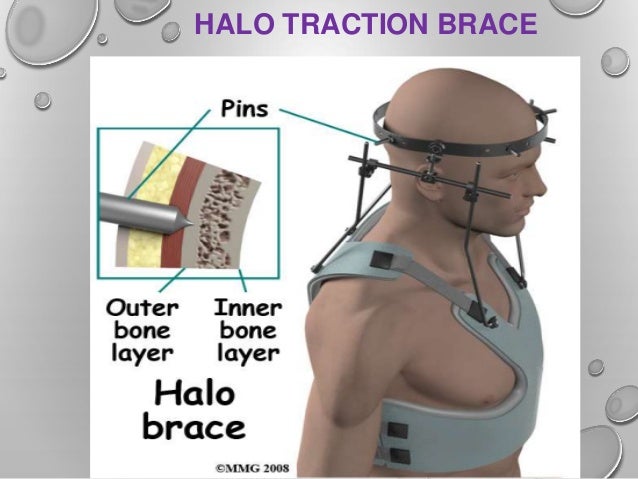 98. 98. (1) HALO TRACTION • Rigid Frame Design • Commonly used in unstable fractures • Limits All motion • Extends Inferior into the Thoracic Region for greater control of all cervical levels • Screws Directly into the skull Disadvantages - Pin problems - Respiratory compromise