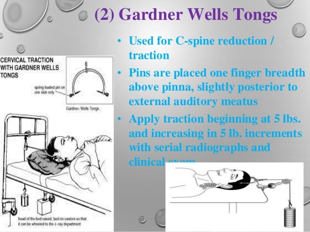 100. 100. (2) Gardner Wells Tongs • Used for C-spine reduction / traction • Pins are placed one finger breadth above pinna, slightly posterior to external auditory meatus • Apply traction beginning at 5 lbs. and increasing in 5 lb. increments with serial radiographs and clinical exam