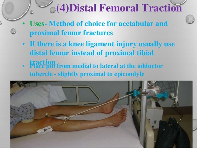 102. 102. (4)Distal Femoral Traction • Uses- Method of choice for acetabular and proximal femur fractures • If there is a knee ligament injury usually use distal femur instead of proximal tibial traction • Place pin from medial to lateral at the adductor tubercle - slightly proximal to epicondyle