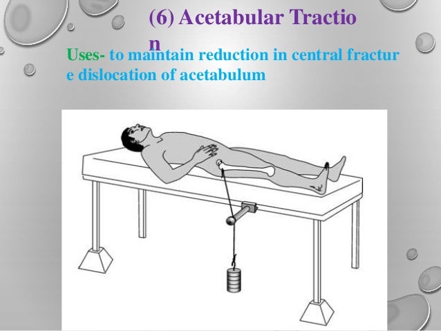 104. 104. (6) Acetabular Tractio n Uses- to maintain reduction in central fractur e dislocation of acetabulum