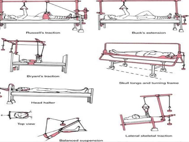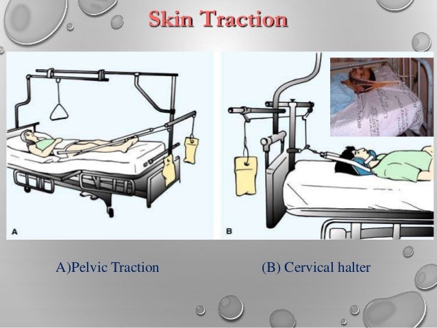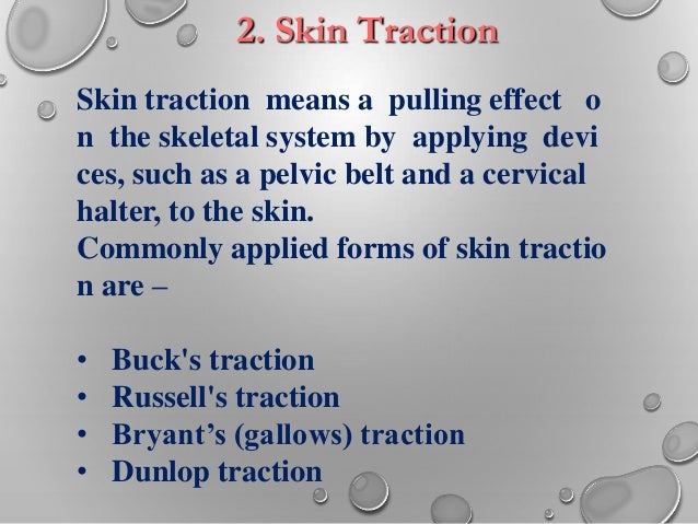 82. 82. 2. Skin Traction Skin traction means a pulling effect o n the skeletal system by applying devi ces, such as a pelvic belt and a cervical halter, to the skin. Commonly applied forms of skin tractio n are – • • • • Buck's traction Russell's traction Bryant’s (gallows) traction Dunlop traction