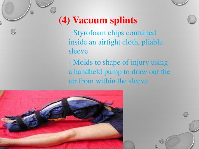 12. 12. (4) Vacuum splints - Styrofoam chips contained inside an airtight cloth, pliable sleeve - Molds to shape of injury using a handheld pump to draw out the air from within the sleeve