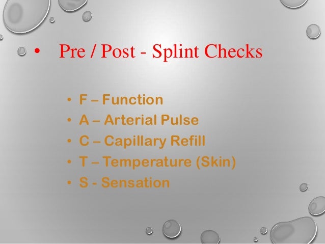 13. 13. • Pre / Post - Splint Checks • • • • • F – Function A – Arterial Pulse C – Capillary Refill T – Temperature (Skin) S - Sensation