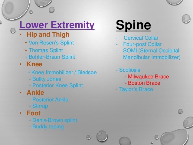 15. 15. Lower Extremity • Hip and Thigh - Von Rosen’s Splint - Thomas Splint - Bohler-Braun Splint Spine - Cervical Collar Four-post Collar SOMI (Sternal Occipital Mandibular Immobilizer) • Knee - Knee Immobilizer / Bledsoe - Bulky Jones - Posterior Knee Splint • Ankle - Posterior Ankle - Stirrup • Foot - Denis-Brown splint - Buddy taping - Scoliosis - Milwaukee Brace - Boston Brace - Taylor’s Brace