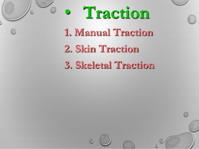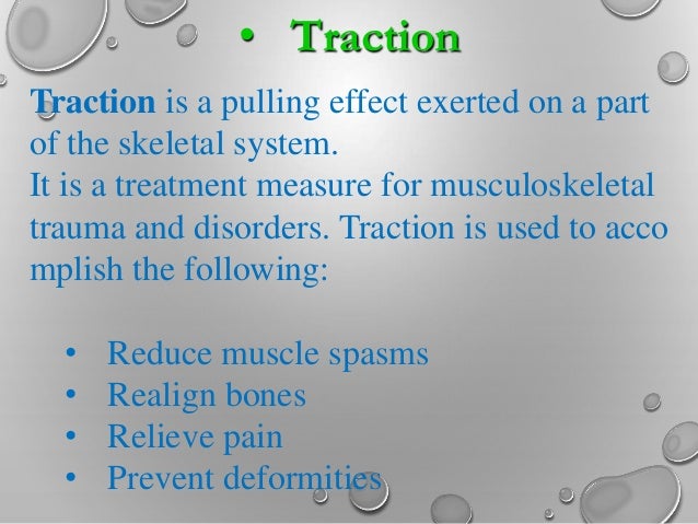 78. 78. • Traction Traction is a pulling effect exerted on a part of the skeletal system. It is a treatment measure for musculoskeletal trauma and disorders. Traction is used to acco mplish the following: • • • • Reduce muscle spasms Realign bones Relieve pain Prevent deformities