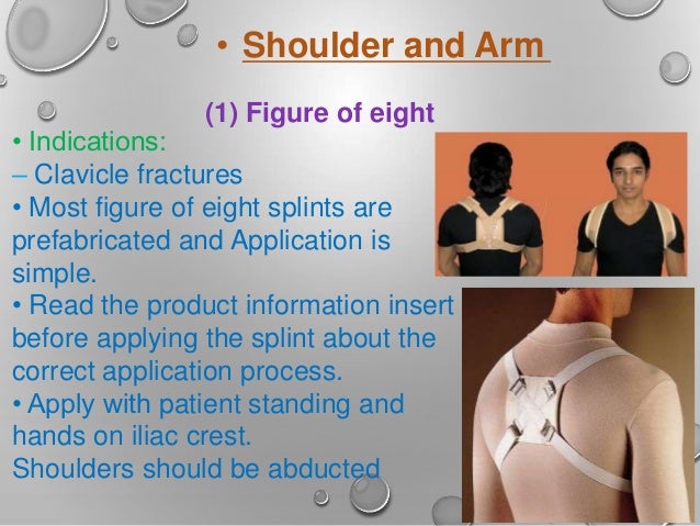 18. 18. • Shoulder and Arm (1) Figure of eight • Indications: – Clavicle fractures • Most figure of eight splints are prefabricated and Application is simple. • Read the product information insert before applying the splint about the correct application process. • Apply with patient standing and hands on iliac crest. Shoulders should be abducted