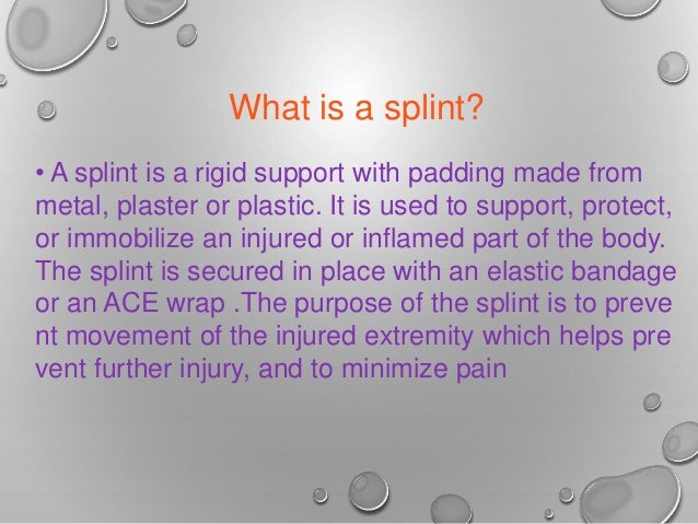 2. 2. What is a splint? • A splint is a rigid support with padding made from metal, plaster or plastic. It is used to support, protect, or immobilize an injured or inflamed part of the body. The splint is secured in place with an elastic bandage or an ACE wrap .The purpose of the splint is to preve nt movement of the injured extremity which helps pre vent further injury, and to minimize pain