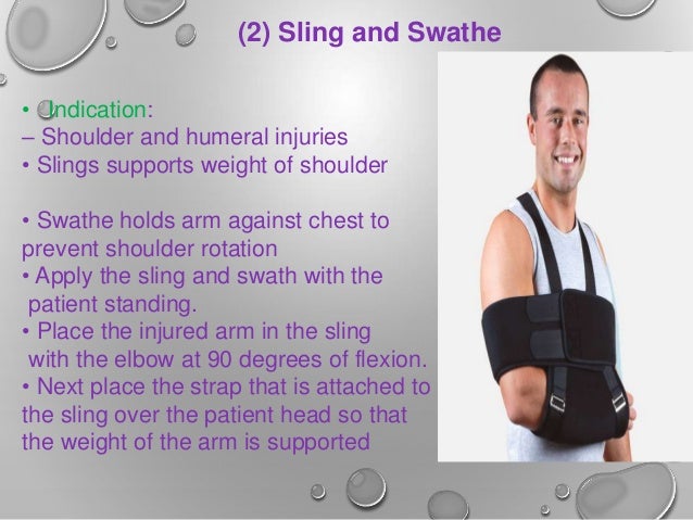 20. 20. (2) Sling and Swathe • Indication: – Shoulder and humeral injuries • Slings supports weight of shoulder • Swathe holds arm against chest to prevent shoulder rotation • Apply the sling and swath with the patient standing. • Place the injured arm in the sling with the elbow at 90 degrees of flexion. • Next place the strap that is attached to the sling over the patient head so that the weight of the arm is supported