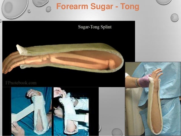 29. 29. (2) Forearm Sugar - Tong • Indications – Wrist and distal forearm fractures • Extends from MCP joints on dorsum of hand, tracks along the forearm, wraps around back of elbow to volar surface of the arm and exte nds down to mid-palmer crease • Immobilises wrist, forearm, and elbow