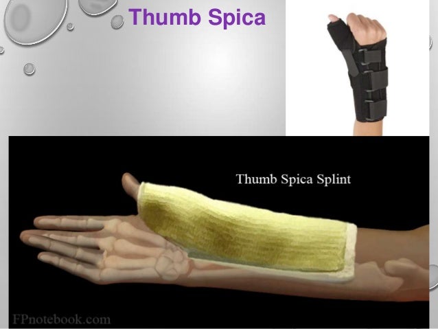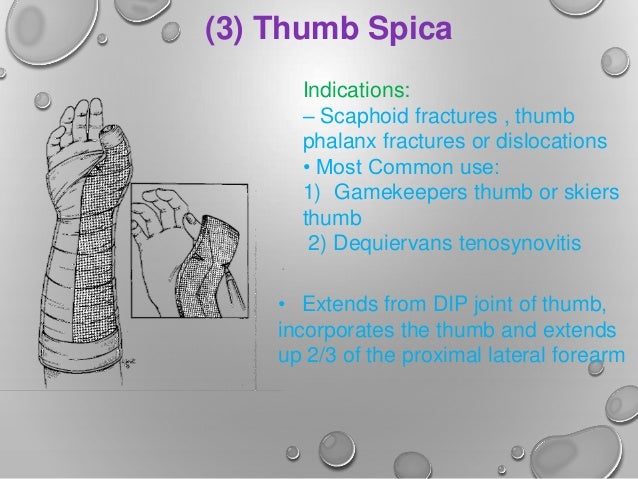 36. 36. (3) Thumb Spica Indications: – Scaphoid fractures , thumb phalanx fractures or dislocations • Most Common use: 1) Gamekeepers thumb or skiers thumb 2) Dequiervans tenosynovitis • Extends from DIP joint of thumb, incorporates the thumb and extends up 2/3 of the proximal lateral forearm