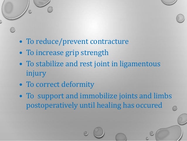 4. 4. • To reduce/prevent contracture • To increase grip strength • To stabilize and rest joint in ligamentous injury • To correct deformity • To support and immobilize joints and limbs postoperatively until healing has occured