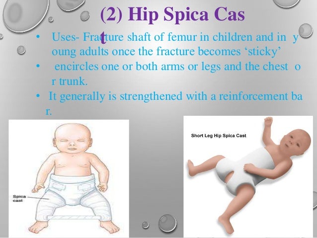 49. 49. • (2) Hip Spica Cas Uses- Fracture shaft of femur in children and in t y oung adults once the fracture becomes ‘sticky’ • encircles one or both arms or legs and the chest o r trunk. • It generally is strengthened with a reinforcement ba r.