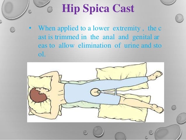 50. 50. Hip Spica Cast • When applied to a lower extremity , the c ast is trimmed in the anal and genital ar eas to allow elimination of urine and sto ol.