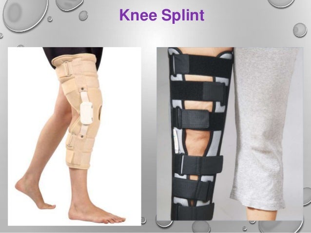 55. 55. • Knee (1) Knee Splint • Indications: - knee injuries - proximal Tib/fib fractures • Place knee in full extension • The plaster is placed from the posterior buttocks to 3 inches above level of bilateral malleoli