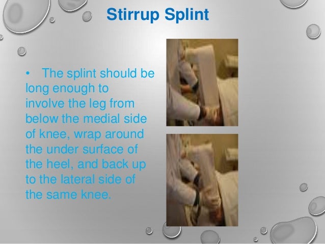 59. 59. Stirrup Splint • The splint should be long enough to involve the leg from below the medial side of knee, wrap around the under surface of the heel, and back up to the lateral side of the same knee.