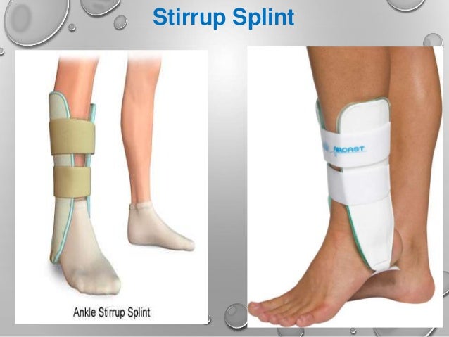 58. 58. (2) Stirrup Splint • Indications - Similar to posterior splint. - Unstable ankle fx • Less inversion /eversion and actually less plantar flexion compared to posterior splint. • Great for ankle sprains. • 12-15 layers of 4-6 inch plaster.