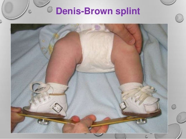61. 61. • Foot (1) Denis-Brown splint Indication – Congenital Talipes Equino Varus (C.T.E.V.) • Used after successful correction of deformity ,to prevent relapse. • used throughout the day before child starts walking. • Once child starts walking ,a DB s plints is used at night and CTEV shoes during the day.