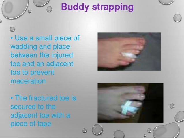 64. 64. Buddy strapping • Use a small piece of wadding and place between the injured toe and an adjacent toe to prevent maceration • The fractured toe is secured to the adjacent toe with a piece of tape