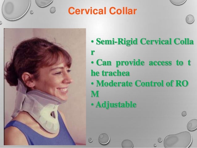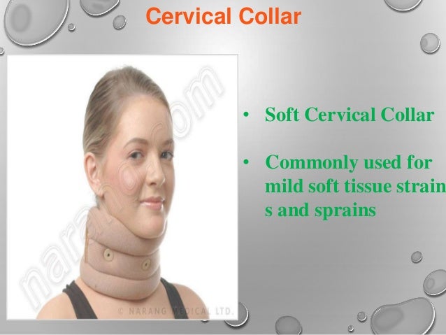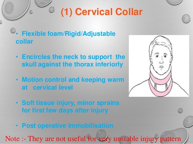 66. 66. (1) Cervical Collar • Flexible foam/Rigid/Adjustable collar • Encircles the neck to support the skull against the thorax inferiorly • Motion control and keeping warm at cervical level • Soft tissue injury, minor sprains for first few days after injury • Post operative immobilisation Note :- They are not useful for very unstable injury pattern