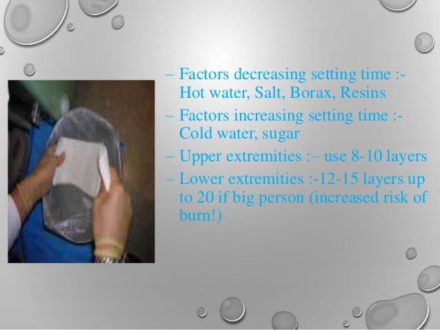 7. 7. – Factors decreasing setting time :Hot water, Salt, Borax, Resins – Factors increasing setting time :Cold water, sugar – Upper extremities :– use 8-10 layers – Lower extremities :-12-15 layers up to 20 if big person (increased risk of burn!)
