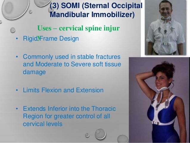 70. 70. (3) SOMI (Sternal Occipital Mandibular Immobilizer) Uses – cervical spine injur • Rigidy Frame Design • Commonly used in stable fractures and Moderate to Severe soft tissue damage • Limits Flexion and Extension • Extends Inferior into the Thoracic Region for greater control of all cervical levels