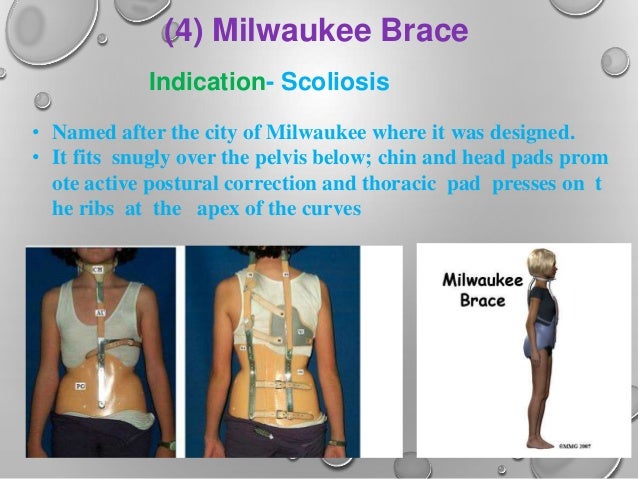 71. 71. (4) Milwaukee Brace Indication- Scoliosis • Named after the city of Milwaukee where it was designed. • It fits snugly over the pelvis below; chin and head pads prom ote active postural correction and thoracic pad presses on t he ribs at the apex of the curves