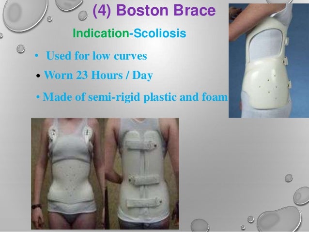72. 72. (4) Boston Brace Indication-Scoliosis • Used for low curves • Worn 23 Hours / Day • Made of semi-rigid plastic and foam