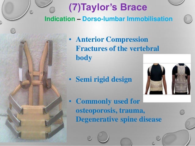 76. 76. (7)Taylor’s Brace Indication – Dorso-lumbar Immobilisation • Anterior Compression Fractures of the vertebral body • Semi rigid design • Commonly used for osteoporosis, trauma, Degenerative spine disease