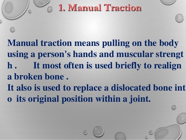 80. 80. 1. Manual Traction Manual traction means pulling on the body using a person's hands and muscular strengt h. It most often is used briefly to realign a broken bone . It also is used to replace a dislocated bone int o its original position within a joint.