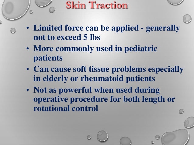 83. 83. Skin Traction • Limited force can be applied - generally not to exceed 5 lbs • More commonly used in pediatric patients • Can cause soft tissue problems especially in elderly or rheumatoid patients • Not as powerful when used during operative procedure for both length or rotational control