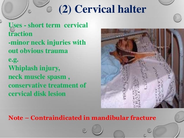 86. 86. (2) Cervical halter Uses - short term cervical traction -minor neck injuries with out obvious trauma e.g. Whiplash injury, neck muscle spasm , conservative treatment of cervical disk lesion Note – Contraindicated in mandibular fracture