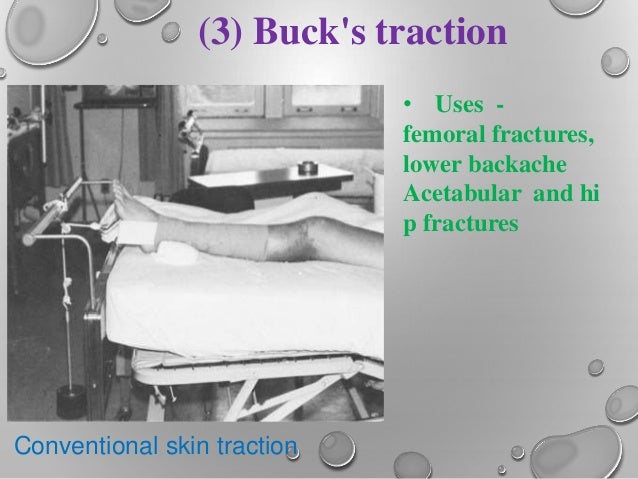 87. 87. (3) Buck's traction • Uses femoral fractures, lower backache Acetabular and hi p fractures Conventional skin traction