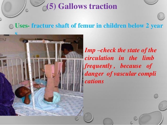 90. 90. (5) Gallows traction Uses- fracture shaft of femur in children below 2 year s Imp –check the state of the circulation in the limb frequently , because of danger of vascular compli cations