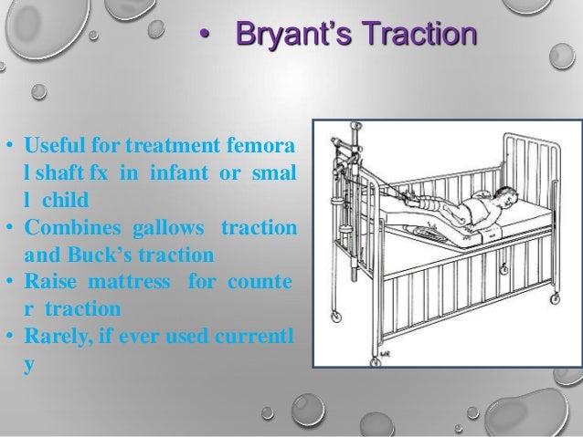 91. 91. • Bryant’s Traction • Useful for treatment femora l shaft fx in infant or smal l child • Combines gallows traction and Buck’s traction • Raise mattress for counte r traction • Rarely, if ever used currentl y