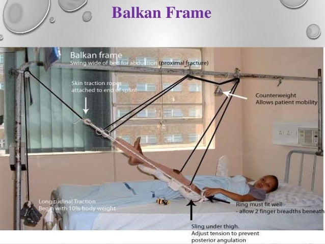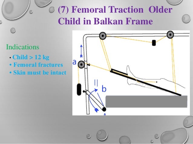 94. 94. (7) Femoral Traction Older Child in Balkan Frame Indications • Child > 12 kg • Femoral fractures • Skin must be intact