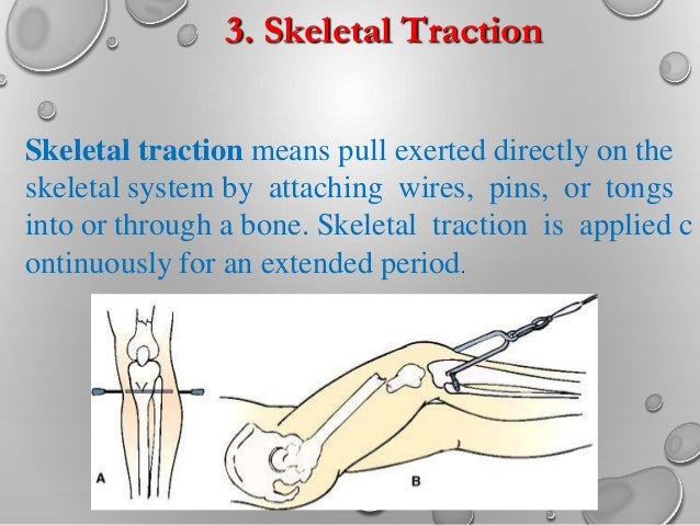 96. 96. 3. Skeletal Traction Skeletal traction means pull exerted directly on the skeletal system by attaching wires, pins, or tongs into or through a bone. Skeletal traction is applied c ontinuously for an extended period.