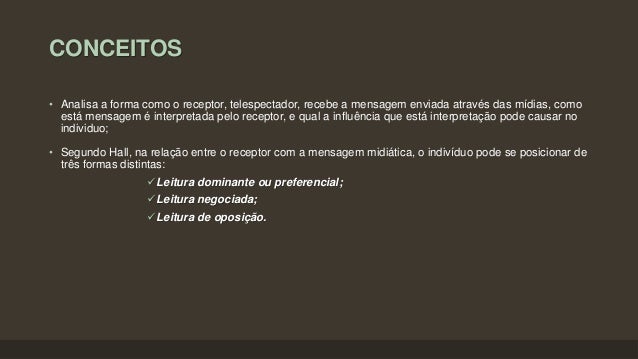11. 11. CONCEITOS • Analisa a forma como o receptor, telespectador, recebe a mensagem enviada através das mídias, como está mensagem é interpretada pelo receptor, e qual a influência que está interpretação pode causar no individuo; • Segundo Hall, na relação entre o receptor com a mensagem midiática, o indivíduo pode se posicionar de três formas distintas: Leitura dominante ou preferencial; Leitura negociada; Leitura de oposição.
