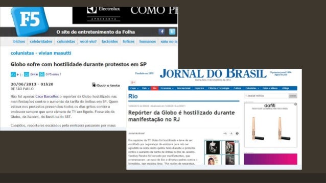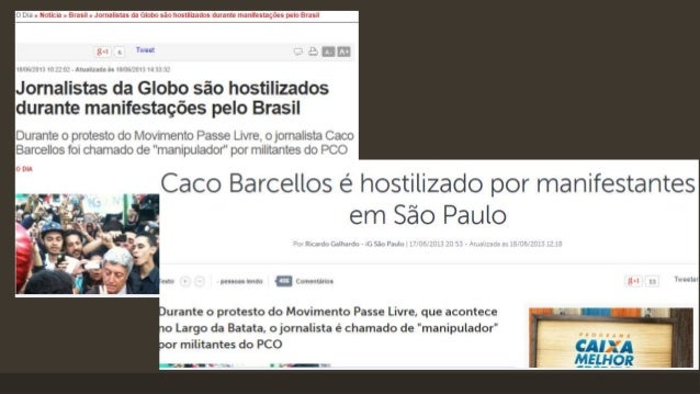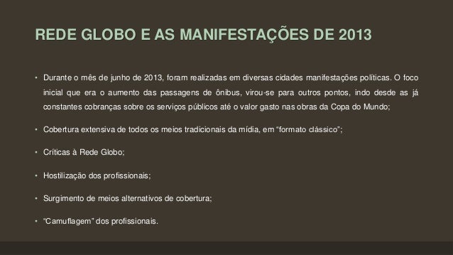 13. 13. REDE GLOBO E AS MANIFESTAÇÕES DE 2013 • Durante o mês de junho de 2013, foram realizadas em diversas cidades manifestações políticas. O foco inicial que era o aumento das passagens de ônibus, virou-se para outros pontos, indo desde as já constantes cobranças sobre os serviços públicos até o valor gasto nas obras da Copa do Mundo; • Cobertura extensiva de todos os meios tradicionais da mídia, em “formato clássico”; • Críticas à Rede Globo; • Hostilização dos profissionais; • Surgimento de meios alternativos de cobertura; • “Camuflagem” dos profissionais.