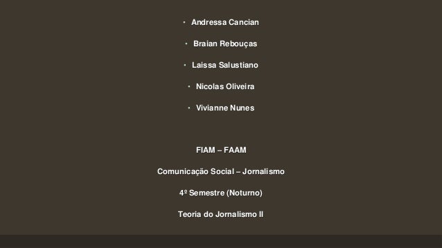 2. 2. • Andressa Cancian • Braian Rebouças • Laissa Salustiano • Nicolas Oliveira • Vivianne Nunes FIAM – FAAM Comunicação Social – Jornalismo 4º Semestre (Noturno) Teoria do Jornalismo II