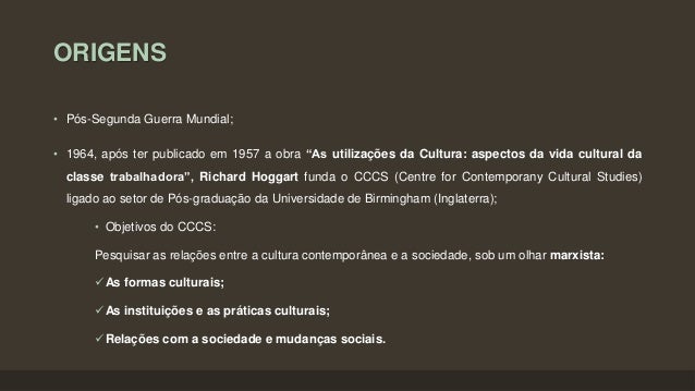 4. 4. ORIGENS • Pós-Segunda Guerra Mundial; • 1964, após ter publicado em 1957 a obra “As utilizações da Cultura: aspectos da vida cultural da classe trabalhadora”, Richard Hoggart funda o CCCS (Centre for Contemporany Cultural Studies) ligado ao setor de Pós-graduação da Universidade de Birmingham (Inglaterra); • Objetivos do CCCS: Pesquisar as relações entre a cultura contemporânea e a sociedade, sob um olhar marxista: As formas culturais; As instituições e as práticas culturais; Relações com a sociedade e mudanças sociais.