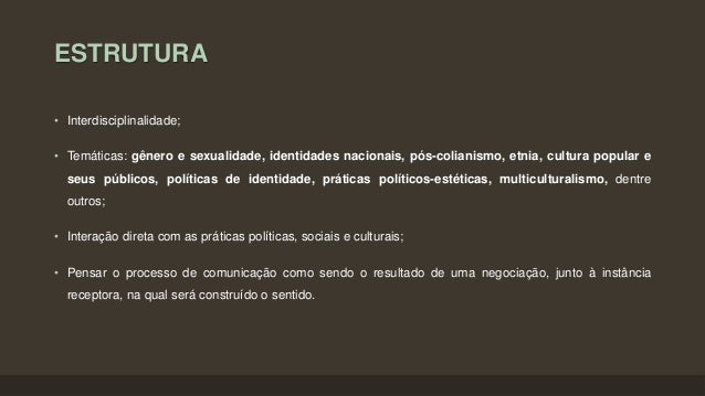 8. 8. ESTRUTURA • Interdisciplinalidade; • Temáticas: gênero e sexualidade, identidades nacionais, pós-colianismo, etnia, cultura popular e seus públicos, políticas de identidade, práticas políticos-estéticas, multiculturalismo, dentre outros; • Interação direta com as práticas políticas, sociais e culturais; • Pensar o processo de comunicação como sendo o resultado de uma negociação, junto à instância receptora, na qual será construído o sentido.