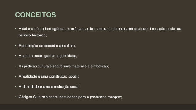 9. 9. CONCEITOS • A cultura não e homogênea, manifesta-se de maneiras diferentes em qualquer formação social ou período histórico; • Redefinição do conceito de cultura; • A cultura pode ganhar legitimidade; • As práticas culturais são formas materiais e simbólicas; • A realidade é uma construção social; • A identidade é uma construção social; • Códigos Culturais criam identidades para o produtor e receptor;