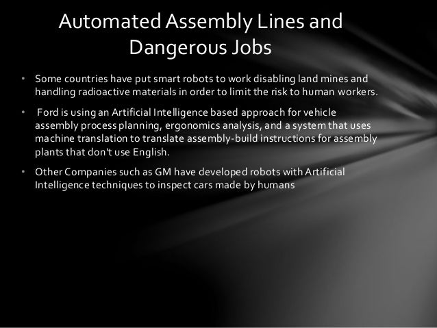 10. 10. • Some countries have put smart robots to work disabling land mines and handling radioactive materials in order to limit the risk to human workers. • Ford is using an Artificial Intelligence based approach for vehicle assembly process planning, ergonomics analysis, and a system that uses machine translation to translate assembly-build instructions for assembly plants that don't use English. • Other Companies such as GM have developed robots with Artificial Intelligence techniques to inspect cars made by humans Automated Assembly Lines and Dangerous Jobs