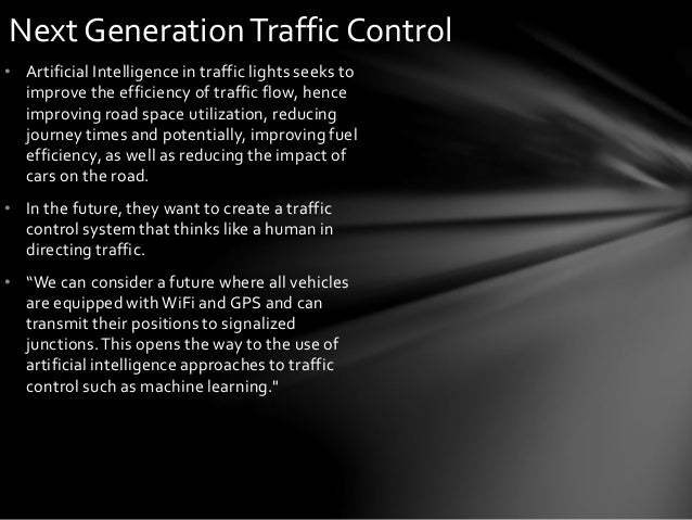 11. 11. • Artificial Intelligence in traffic lights seeks to improve the efficiency of traffic flow, hence improving road space utilization, reducing journey times and potentially, improving fuel efficiency, as well as reducing the impact of cars on the road. • In the future, they want to create a traffic control system that thinks like a human in directing traffic. • “We can consider a future where all vehicles are equipped with WiFi and GPS and can transmit their positions to signalized junctions.This opens the way to the use of artificial intelligence approaches to traffic control such as machine learning." Next GenerationTraffic Control
