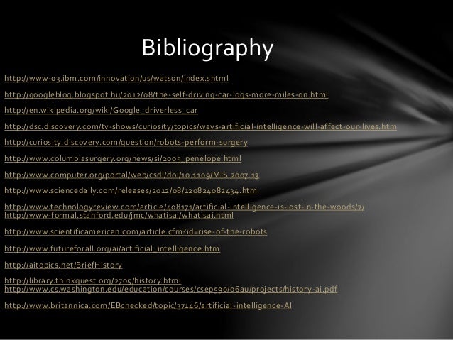 18. 18. http://www-03.ibm.com/innovation/us/watson/index.shtml http://googleblog.blogspot.hu/2012/08/the-self-driving-car-logs-more-miles-on.html http://en.wikipedia.org/wiki/Google_driverless_car http://dsc.discovery.com/tv-shows/curiosity/topics/ways-artificial-intelligence-will-affect-our-lives.htm http://curiosity.discovery.com/question/robots-perform-surgery http://www.columbiasurgery.org/news/si/2005_penelope.html http://www.computer.org/portal/web/csdl/doi/10.1109/MIS.2007.13 http://www.sciencedaily.com/releases/2012/08/120824082434.htm http://www.technologyreview.com/article/408171/artificial-intelligence-is-lost-in-the-woods/7/ http://www-formal.stanford.edu/jmc/whatisai/whatisai.html http://www.scientificamerican.com/article.cfm?id=rise-of-the-robots http://www.futureforall.org/ai/artificial_intelligence.htm http://aitopics.net/BriefHistory http://library.thinkquest.org/2705/history.html http://www.cs.washington.edu/education/courses/csep590/06au/projects/history-ai.pdf http://www.britannica.com/EBchecked/topic/37146/artificial-intelligence-AI Bibliography