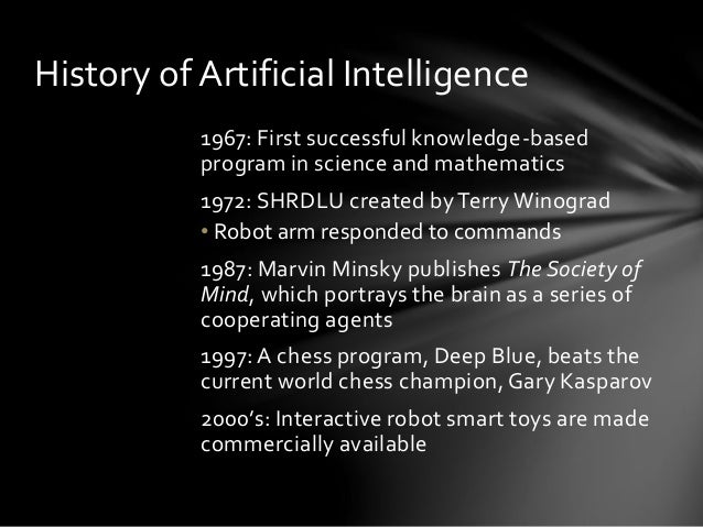 5. 5. History of Artificial Intelligence 1967: First successful knowledge-based program in science and mathematics 1972: SHRDLU created by Terry Winograd • Robot arm responded to commands 1987: Marvin Minsky publishes The Society of Mind, which portrays the brain as a series of cooperating agents 1997: A chess program, Deep Blue, beats the current world chess champion, Gary Kasparov 2000’s: Interactive robot smart toys are made commercially available