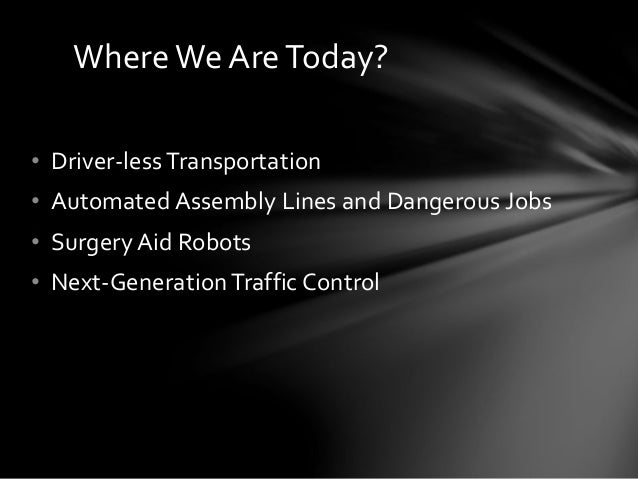 7. 7. • Driver-less Transportation • Automated Assembly Lines and Dangerous Jobs • Surgery Aid Robots • Next-Generation Traffic Control WhereWe AreToday?