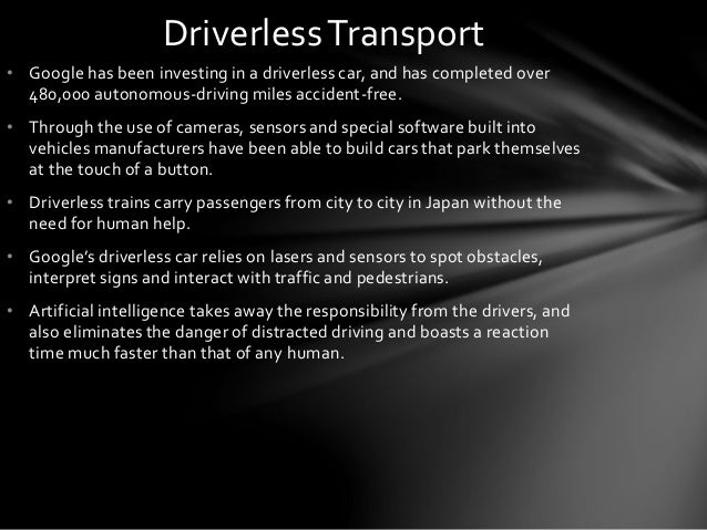 8. 8. • Google has been investing in a driverless car, and has completed over 480,000 autonomous-driving miles accident-free. • Through the use of cameras, sensors and special software built into vehicles manufacturers have been able to build cars that park themselves at the touch of a button. • Driverless trains carry passengers from city to city in Japan without the need for human help. • Google’s driverless car relies on lasers and sensors to spot obstacles, interpret signs and interact with traffic and pedestrians. • Artificial intelligence takes away the responsibility from the drivers, and also eliminates the danger of distracted driving and boasts a reaction time much faster than that of any human. DriverlessTransport