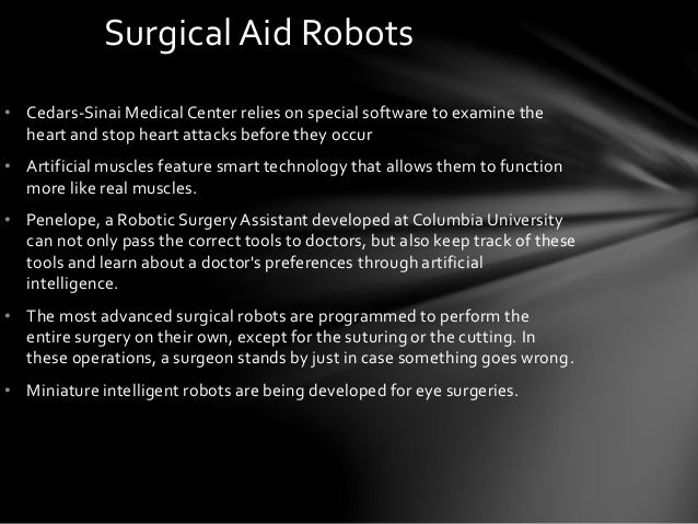 9. 9. • Cedars-Sinai Medical Center relies on special software to examine the heart and stop heart attacks before they occur • Artificial muscles feature smart technology that allows them to function more like real muscles. • Penelope, a Robotic Surgery Assistant developed at Columbia University can not only pass the correct tools to doctors, but also keep track of these tools and learn about a doctor's preferences through artificial intelligence. • The most advanced surgical robots are programmed to perform the entire surgery on their own, except for the suturing or the cutting. In these operations, a surgeon stands by just in case something goes wrong. • Miniature intelligent robots are being developed for eye surgeries. Surgical Aid Robots